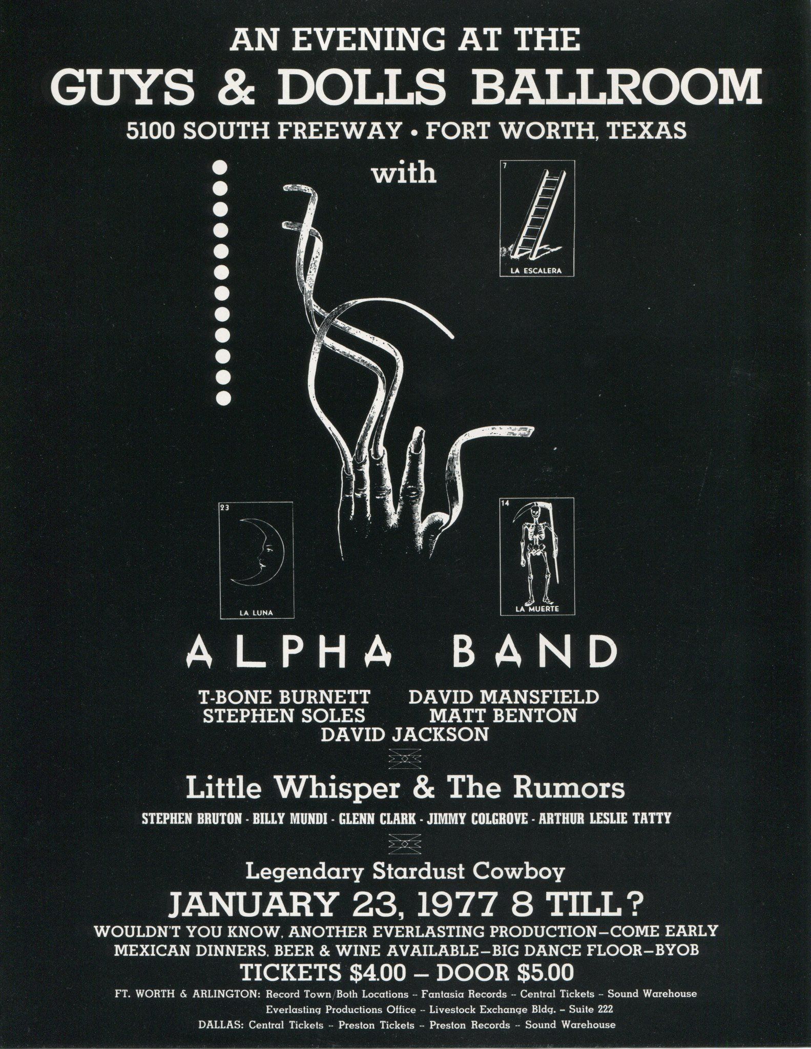 Poster from an infamous Alpha Band concert. Note the opening acts, Little Whisper and the Rumors (Stephen Bruton and Glen Clark) anf the Legendary Stardust Cowboy!