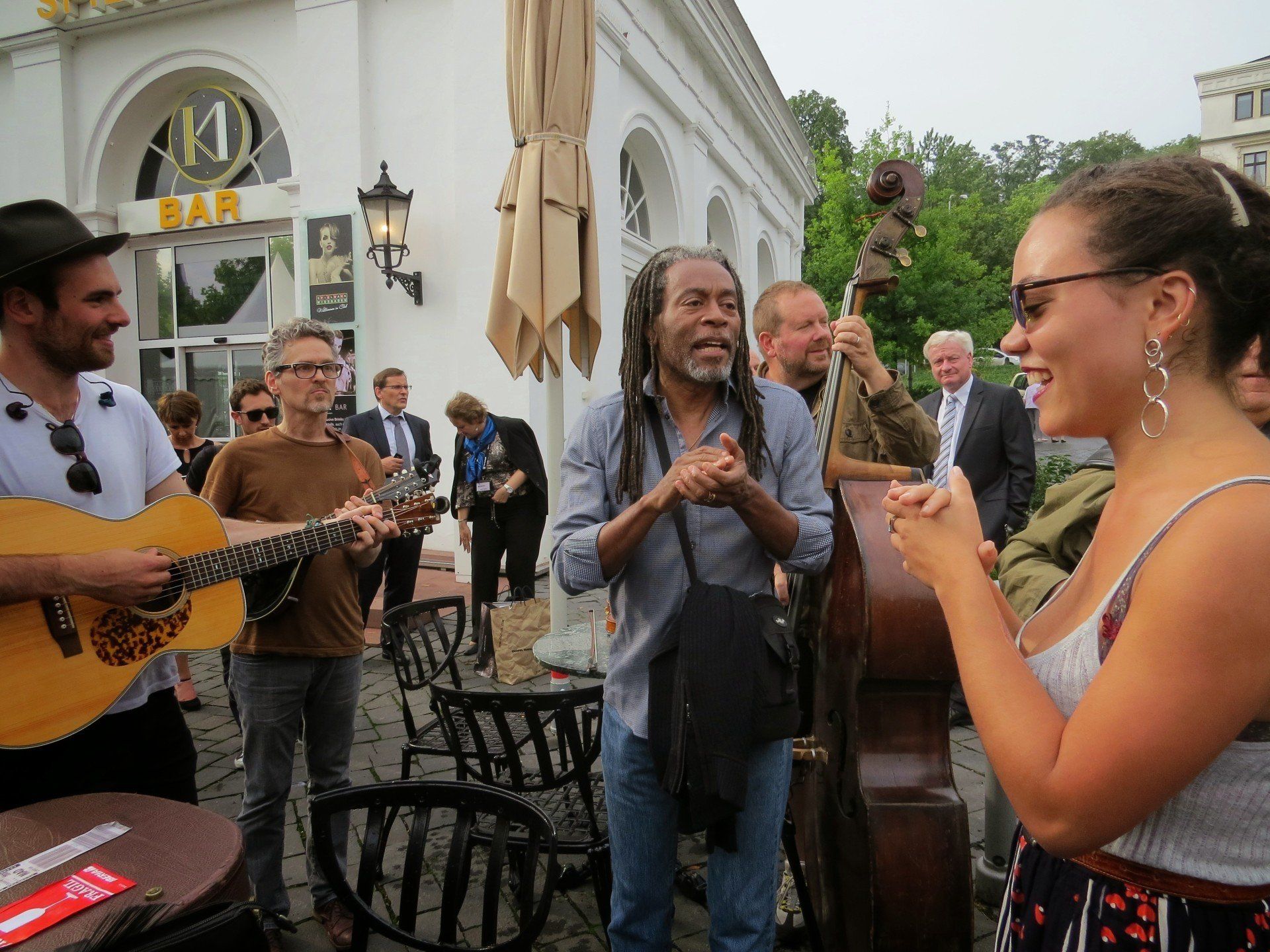 With Bobby and the SpiritYouAll band, busking outside the venue in Germany. Photo by Kate Elliott.